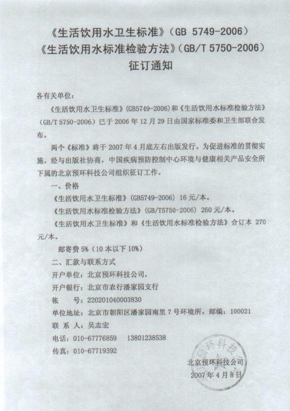 生活饮用水新标准征订通知