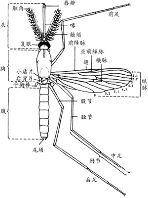 蚊类是双翅目(Diptera)蚊科(Culicidae)昆虫,成虫刺吸式口器适于吸血。 蚊类有一对膜质透明的前翅,后翅退化为肉眼看不见的平衡棒。