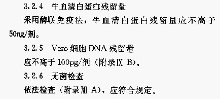 《中华人民共和国药典2005年版(三部)》中规定,冻干人用狂犬病疫苗(Vero细胞)DNA残留量应不高于100pg/剂,截图如下: