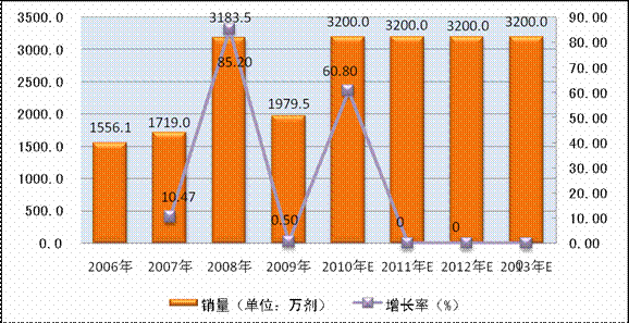 2008年A群C群脑膜炎球菌多糖疫苗被纳入国家免疫规划后,国家招标采购3200万剂,较2007年增长了85.2%。2009年,该疫苗销售量为1979.5万剂,预计未来国家将继续进行招标采购,每年规模维持在3200万剂左右。