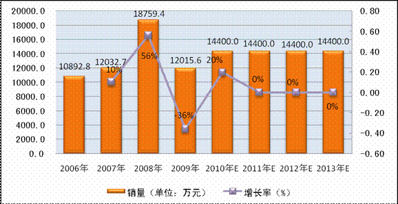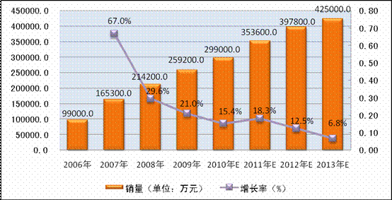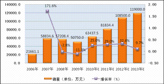 图表 15:2006年-2013年甲肝疫苗市场规模及趋势(按销量)