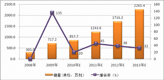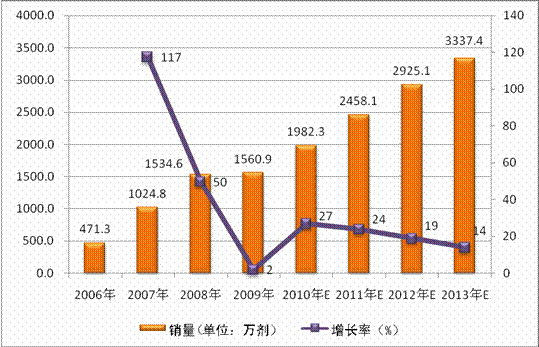 A、C群脑膜炎球菌结合疫苗2007年上市,规模为371.5万剂,2008年有增长较快,达到630万剂,到2009年销量为达到682.5万剂。以2009年为基数,预计该疫苗将以34%左右的复合增长率增长,到2013年市场规模达到2200万剂左右。