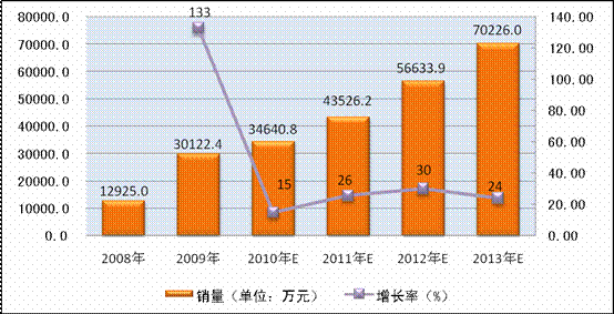 图表 9:2008年-2013年ACYW135群脑膜炎球菌多糖疫苗市场规模及趋势(按销量)