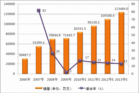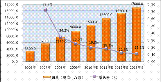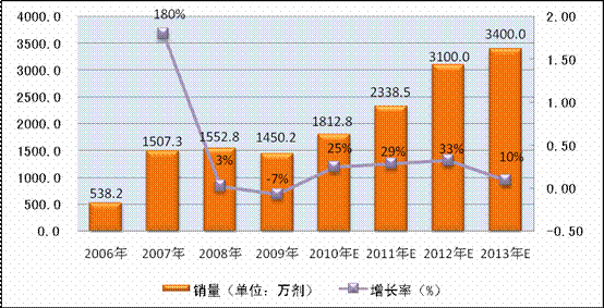 图表 12:2006年-2013年b型流感嗜血杆菌结合疫苗市场规模及趋势(按销量)