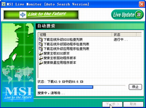 2.通过MSI Live Montor程序升级 运行桌面上的“MSI Live Montor”快捷图标,在打开的程序主窗口中确保选中了“搜索主板BIOS版本”项,如果要同时升级主板驱动程序以及微星相关应用程序,那么可将其余两项一并选取,然后点击“下一步”按钮,此时在主窗口中将显示升级过程,在状态栏中也会看到程序下载的进度(如图4)。