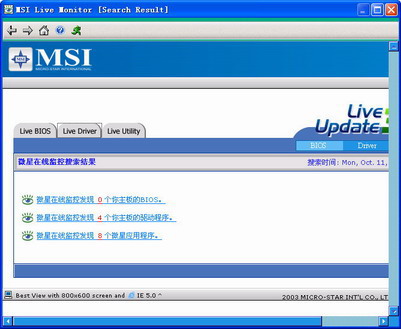 当搜索和下载完毕后点击“结束”按钮,此时将会弹出搜索结果窗口(如图5),这时如果提示有最新BIOS版本,那么点击“Live BIOS”,在随后出现的窗口中点击“Live Update”即可下载最新BIOS程序,最后按照提示进行升级即可。同样,点击“Live Driver”和“Live Utility”即可分别升级主板驱动以及微星相关应用程序。