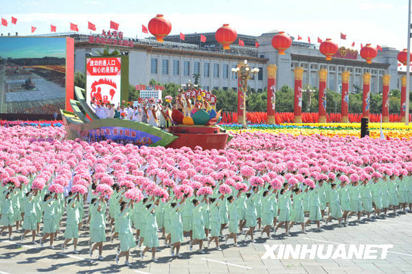 在60周年国庆游行队伍的人口与卫生彩车上, 11名公共卫生与医护人员代表全国700万医务工作者参与了共和国历史上的这一空前盛典。