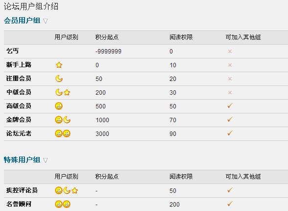 你前两个ID“疾控阳光”和“寒冬”是“高级会员”,后一个ID“韩冬”已经是“金牌会员”了,比“高级会员”更高一级。另外,你的ID太多了,建议以后只用一个ID吧。论坛用户组是根据积分而设定的,达到相应的积分即可成为该用户组成员,权限也有相应改变,具体见下图: