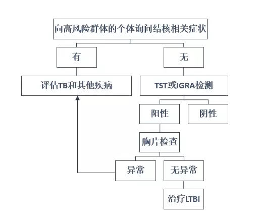 在开始 LTBI 检查和治疗前,询问患者 TB 相关症状。胸片检查用于发现活动性结核。有 TB 症状或胸片异常者应该进行进一步检查证实活动性 TB 或其他情况。在结核发病率估值<100/10 万人的高或中高收入国家,无论 IGRA 还是 TST 皆可用于 LTBI 的检测。在低收入和其他中等收入国家,IGRA 不应替代 TST。